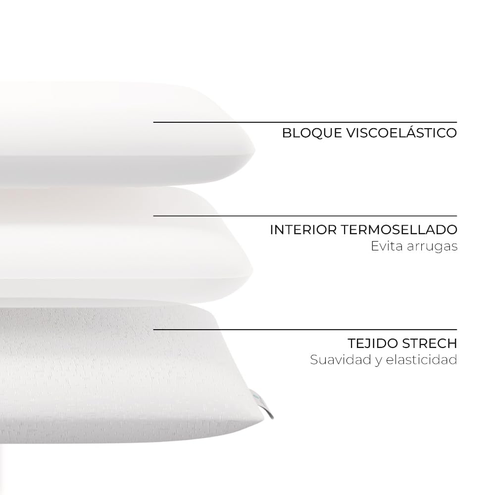 - BLOQUE 100% VISCOEÁSTICO con una firmeza media y un confort excelente. Sentirás como la almohada se amolda a tu cuello y cabeza con una acogida suave y una agradable sensación en la tumbada. Es ideal para dormir de lado y boca arriba.